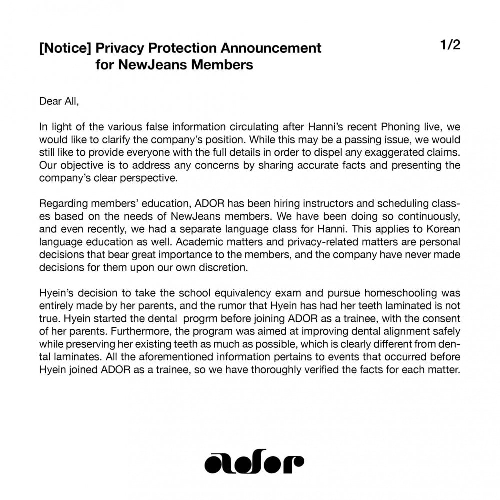 Le 22 novembre, ADOR, l’agence de gestion du groupe de filles NewJeans, a publié une déclaration officielle en réponse aux fausses informations circulant sur le groupe. La déclaration visait à rectifier la situation et à clarifier toute confusion générée par des événements récents, en particulier ceux liés à la session Phoning de la membre Hanni.