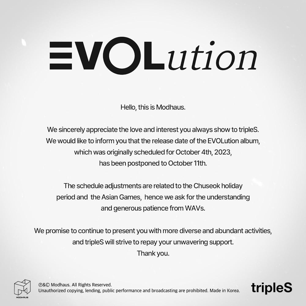 La sub-unit tripleS EVOLution a annoncé un changement dans la date de sortie de son album de début. Initialement prévue pour le 4 octobre , la sortie est désormais prévue pour le 11 octobre. Cette modification découle de la période de Chuseok et des Jeux asiatiques.