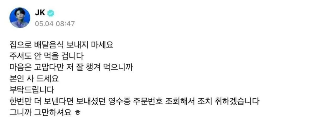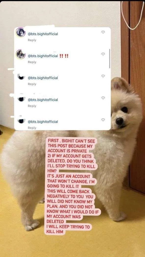 Un compte Instagram en particulier a suscité des critiques pour avoir publié une image d’un couteau et affirmé vouloir tuer Jungkook en représailles à son refus de la nourriture qui lui avait été envoyée. Ces menaces de mort sont alarmantes et représentent une atteinte grave à la sécurité et à la vie privée de Jungkook.