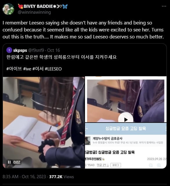 Un internaute a posté : « Même si elle fait de la promotion avec IVE, elle est venue à l’école. Elle a fait une petite sieste pendant les cours, mais elle a signé des autographes à toutes les personnes qui le demandaient. C’est un ange ! » De nombreux fans sont contrariés par le fait que Leeseo aurait été harcelée pour signer des autographes à l’école, bien qu’elle y soit en tant qu’étudiante.