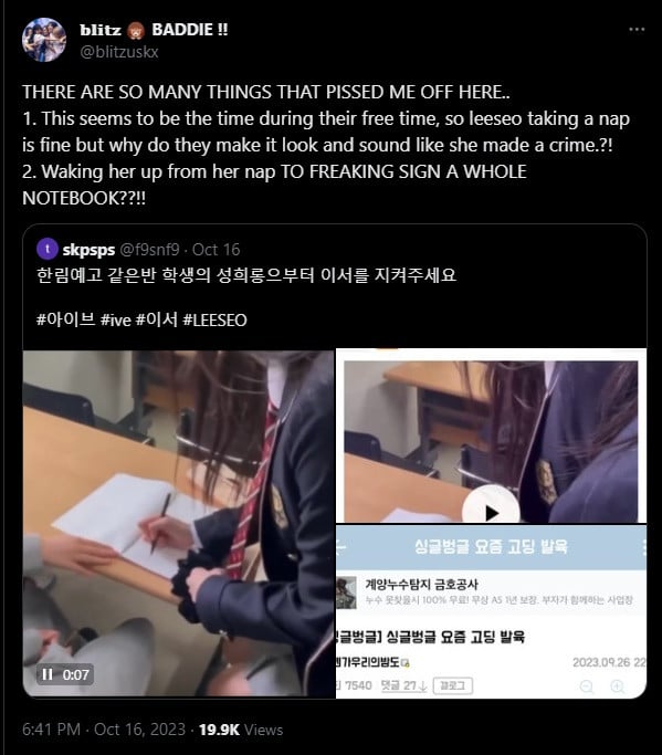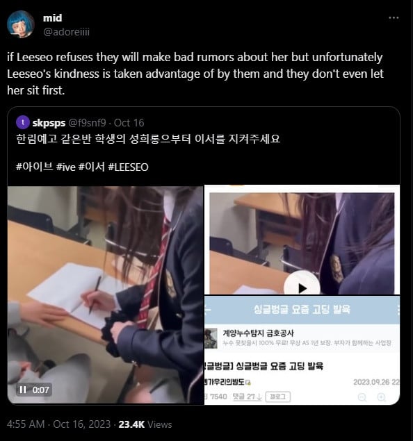 Un autre net-citoyen coréen a affirmé que Leeseo était victime de harcèlement sexuel car un clip montre un étudiant qui a demandé un autographe avec ce qui semble être une érection. Dans le message ci-dessous, un internaute écrit : « Protégez Leeseo, qui a été victime de harcèlement sexuel de la part d’un camarade de classe au lycée Hanlim Arts ». Un message sur un forum coréen fait également référence à l’érection présumée du camarade de classe.
