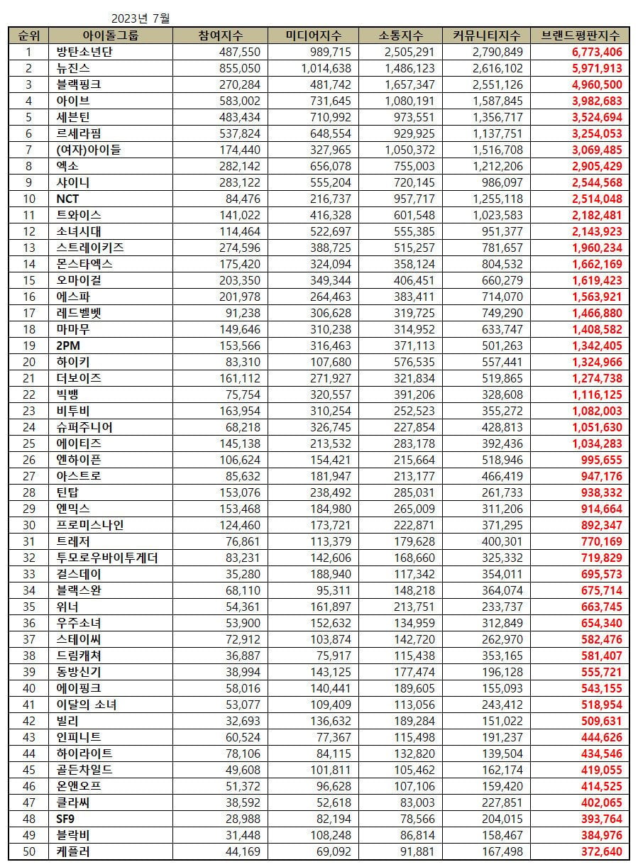 Dans l’univers hautement concurrentiel de la K-Pop, la puissance de la marque joue un rôle crucial pour déterminer le succès et la popularité des groupes d’idols. Pour le mois de juillet, l’Institut coréen de recherche sur la marque a analysé de grandes quantités de données des groupes d’idols K-Pop actuellement en promotion afin de déterminer la puissance globale de chaque groupe.