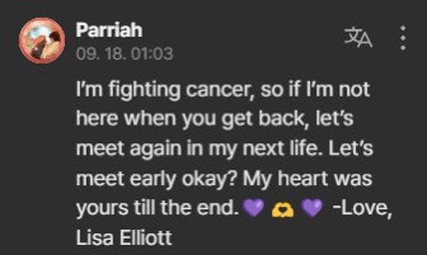 Une fan a écrit : « Je lutte contre le cancer, donc si je ne suis pas là quand tu reviens, retrouvons-nous dans ma prochaine vie. Retrouvons-nous tôt, d’accord ? Mon cœur t’appartenait jusqu’à la fin. – Avec tout mon amour, Lisa Elliott. »