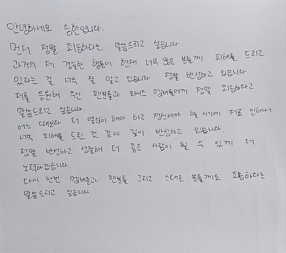 En réponse à la controverse, Seunghan a publié une nouvelle excuse manuscrite le même jour que l’annonce de la suspension. Dans cette lettre, il exprime un profond regret, reconnaît le préjudice causé à de nombreuses personnes et présente des excuses spécifiques aux fans qui le soutiennent ainsi qu’aux membres de RIIZE.
